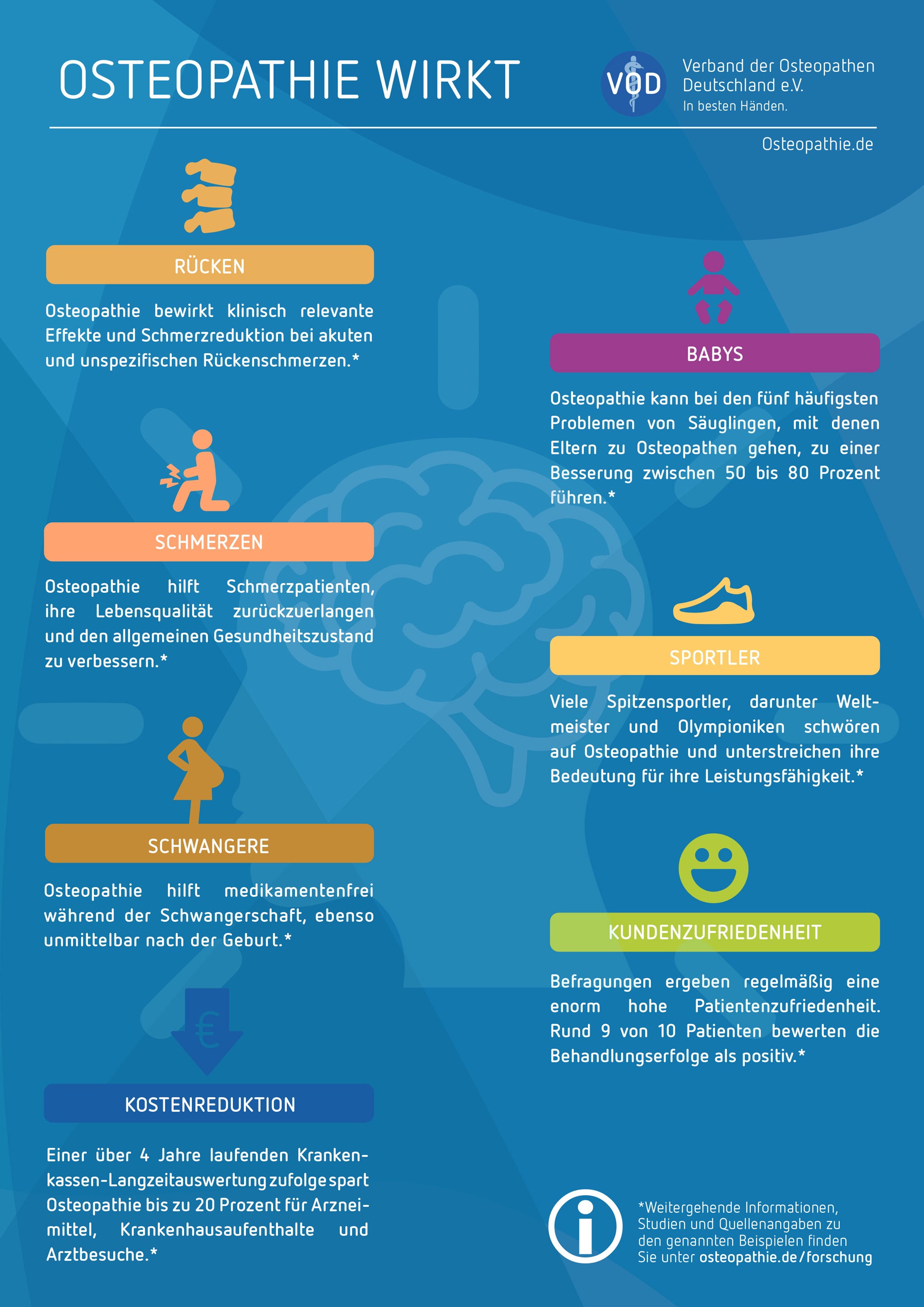 Schulmedizinisch behandelbare Erkrankungen wie z.B. Knochenbrüche, Stoffwechselerkrankungen oder Blinddarmentzündungen gehören nicht zum Behandlungsspektrum der Osteopathie.